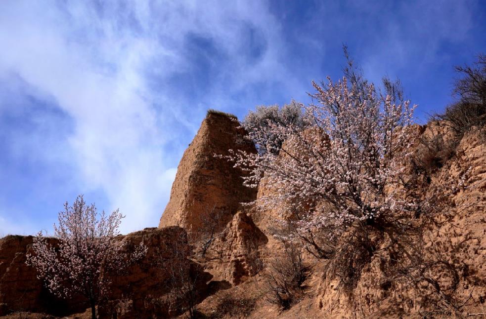 長城在這里修“錯”幾公里,形成了一段世間絕無僅有的長城美景。李二口長城腳下春季杏花白,秋季杏葉紅,與長城相映成趣。每年四月,蒼涼山峁上、溝壑間到處都是怒放的杏花,層次感鮮明,萬般綺麗。據考證,這些老杏樹至少都在百年,即使迎著低溫,依舊怒放。