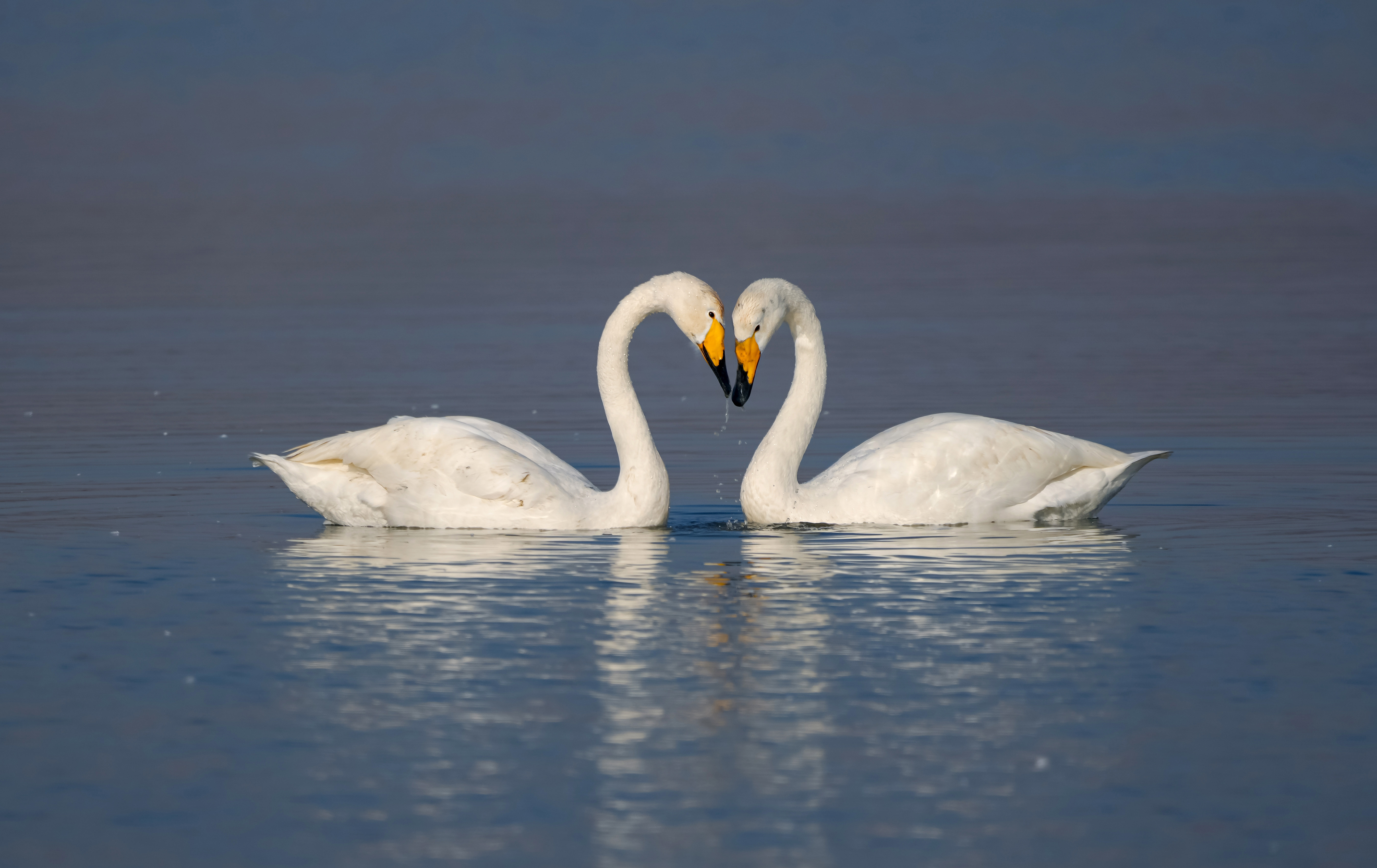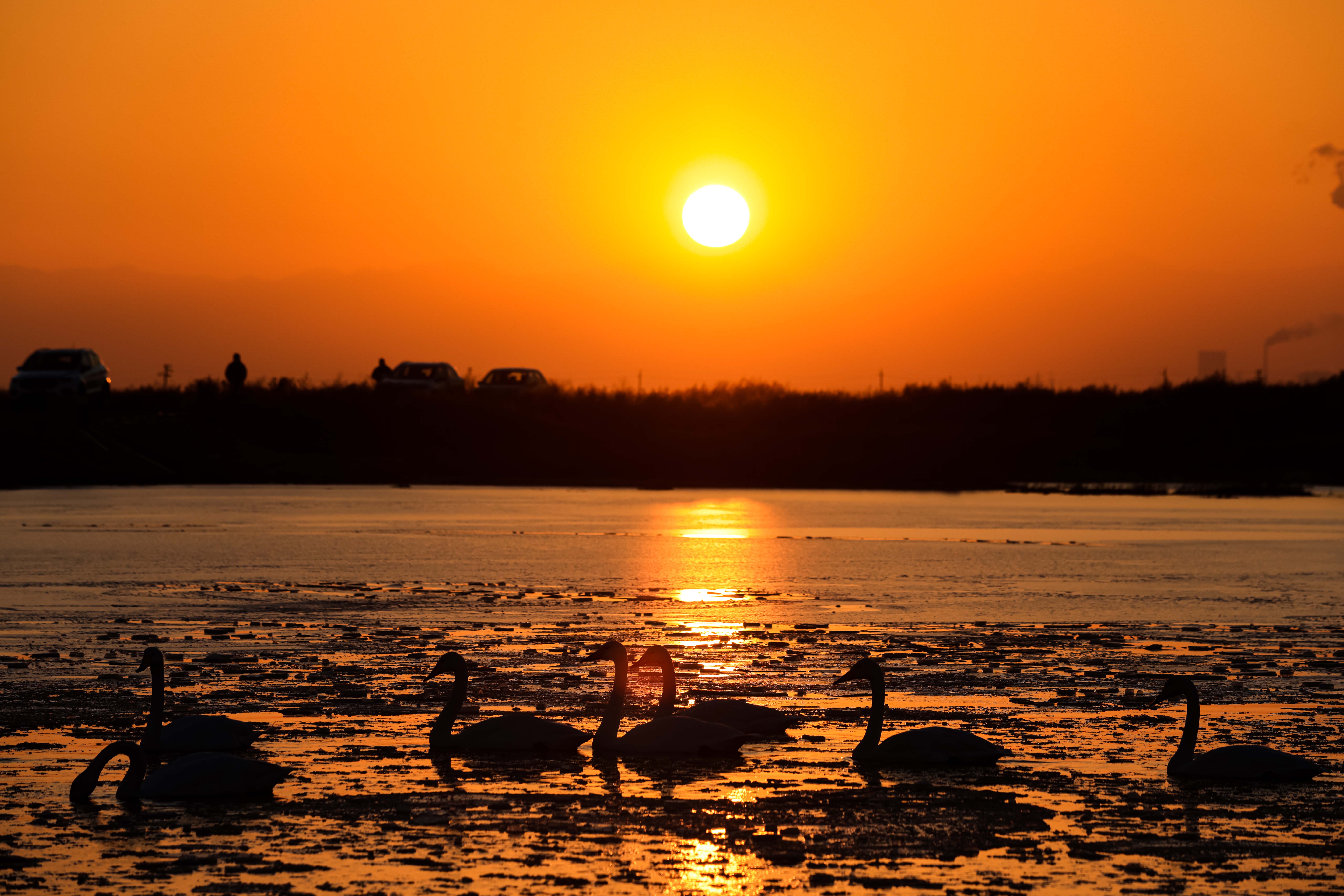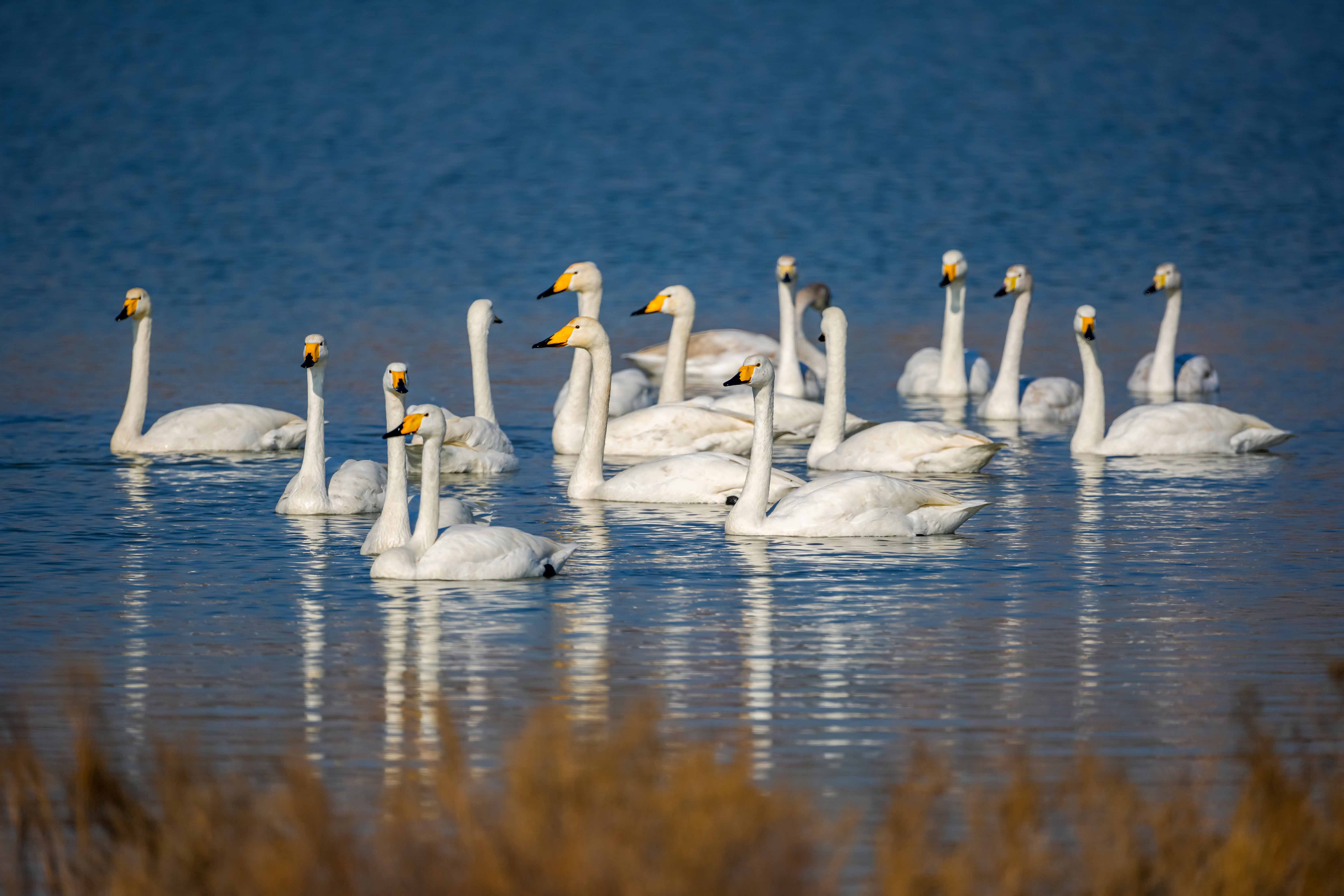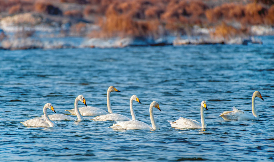 前來越冬的白天鵝或嬉戲、或飛翔、或覓食,成為一道美麗的風景