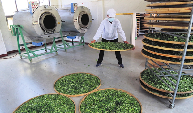 A worker takes forsythia leaves to baking machines at the herbal tea factory in Shanxi.ZHANG DAN / FOR CHINA DAILY