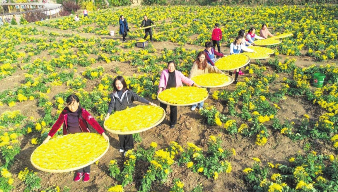 Farmers in Yicheng harvest chrysanthemum flowers. Chrysanthemum is a major cash crop in the county.