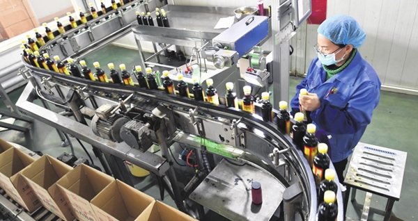 An employe works on an assembly line at Zilin Vinegar in Shanxi.LI ZHAOMIN /FOR CHINA DAILY