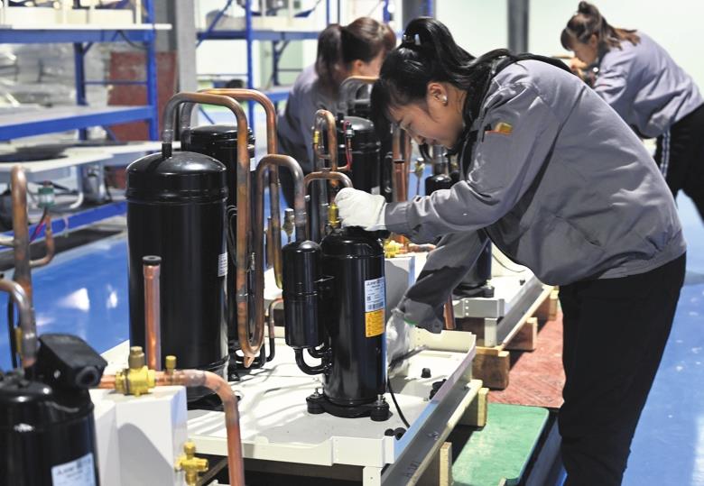 Workers assembles new?energy heating pumps at manufacturing company in Taiyuan. SUN RONGXIANG / FOR CHINA DAILY