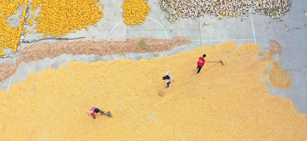 Farmers in Xinjiang county dry corn in the sunlight after a harvest. GAO XINSHENG/FOR CHINA DAILY