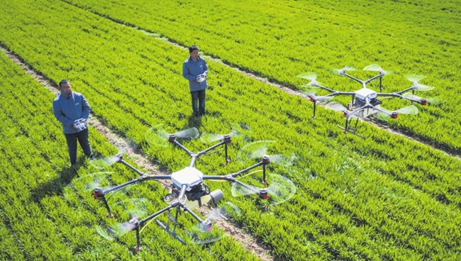 Technicians guide drones to spray fertilizer on a wheat farm in Yicheng county. HU BO / FOR CHINA DAILY