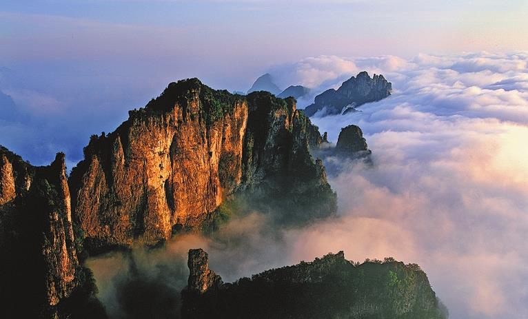 Located in the east of Lingchuan county in Shanxi,Wangmangling presents some of the most impressive sights in Taihang.These include a sea of clouds and sunrise viewed from the main peak;gorgeous valleys surrounded by the rising,red-colored cliffs;groups of waterfalls and highways running along the edge of cliffs.