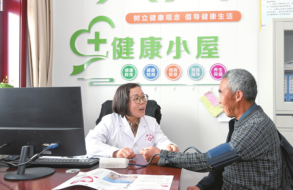 10月30日,在鄉寧縣臺頭鎮嘉和村健康小屋,醫務人員在為群眾測量血壓。鄉寧縣健康小屋啟用以來,積極開展健康知識進萬家、義診等活動,為城鄉居民提供針對血壓、糖尿病等方面的指導服務,筑牢百姓健康第一道防線。(閆銳鵬攝)