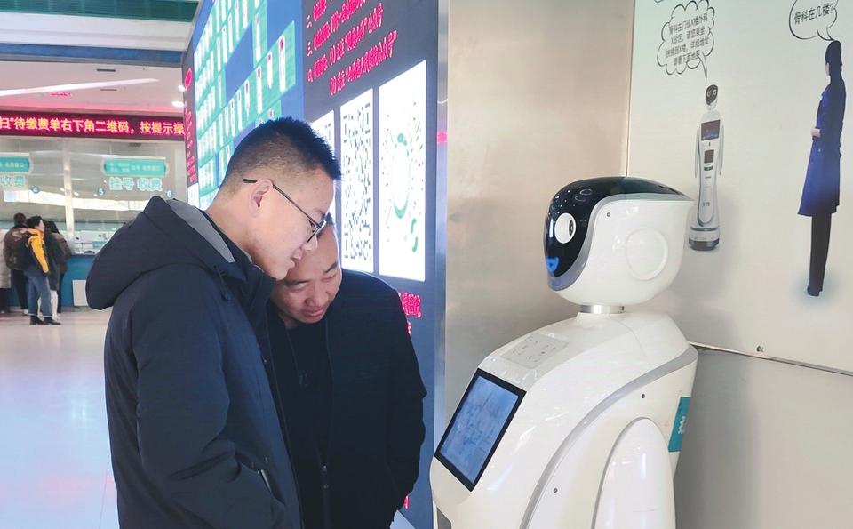 1月6日,在山西省人民醫院門診大廳,群眾通過智能機器人進行導診。近年來,隨著人工智能的發展,智能機器人廣泛應用,有效提升了為群眾服務的效率。(記者張琦攝)