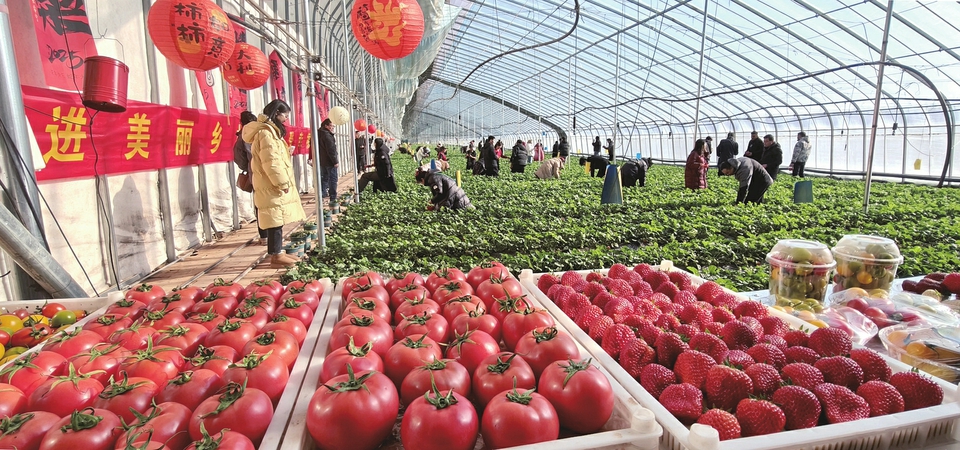 1月8日,太谷區任村鄉任村一座設施蔬菜大棚里,游客正在采摘草莓。近年來,該鄉大力推進設施農業提檔升級,園區建設圍繞設施產業做文章,富了當地農戶腰包的同時,也讓走進鄉村田園的游客體驗到了采摘的快樂。(孫泰雁攝)