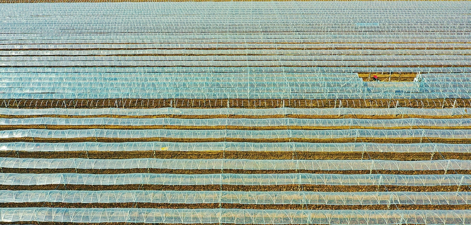 二月九日,俯瞰夏縣裴介鎮師村,田間的葡萄遮雨棚阡陌縱橫,呈現出一幅生機盎然的鄉村振興畫卷。(張秀峰攝)