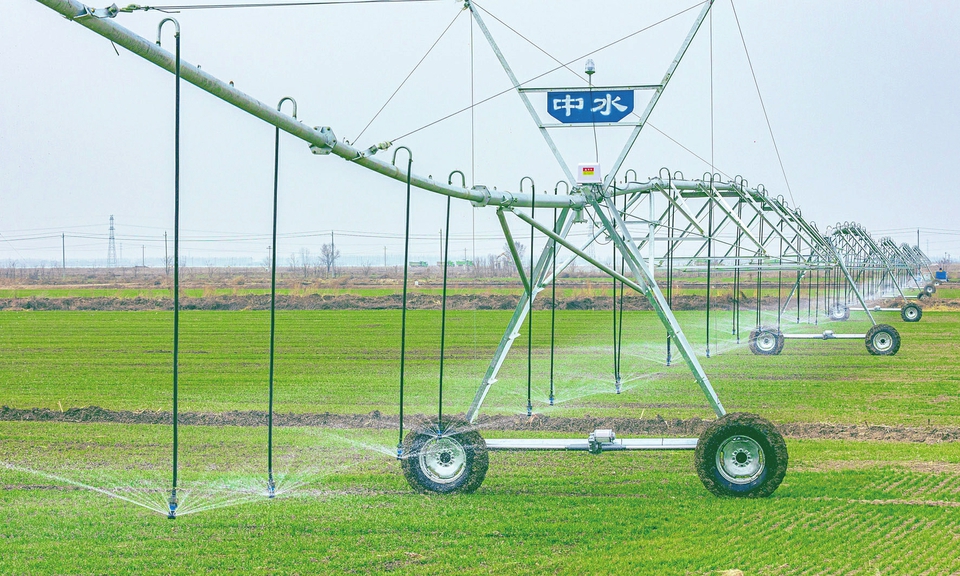 2月28日,永濟市虞鄉農場田間地頭一派農忙景象,農民利用水肥一體平移式噴灌機對小麥進行春澆施肥作業,為今年小麥增產打好基礎。楊建峰攝