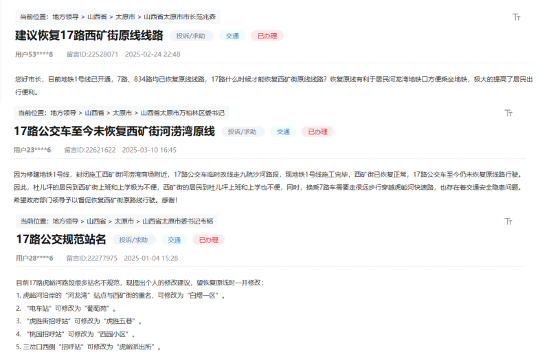 備受關注的太原地鐵1號線開通已有月余,人民網“領導留言板”上,多位網友寫下留言,迫切希望此前因地鐵施工而改線的17路公交車能夠恢復原線路運行,還有網友對其恢復原線后的站點命名提出優化建議。