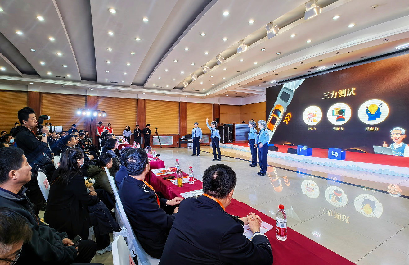 上圖:宣講隊發動現場觀眾進行老年人申領駕駛證“三力”測試互動。