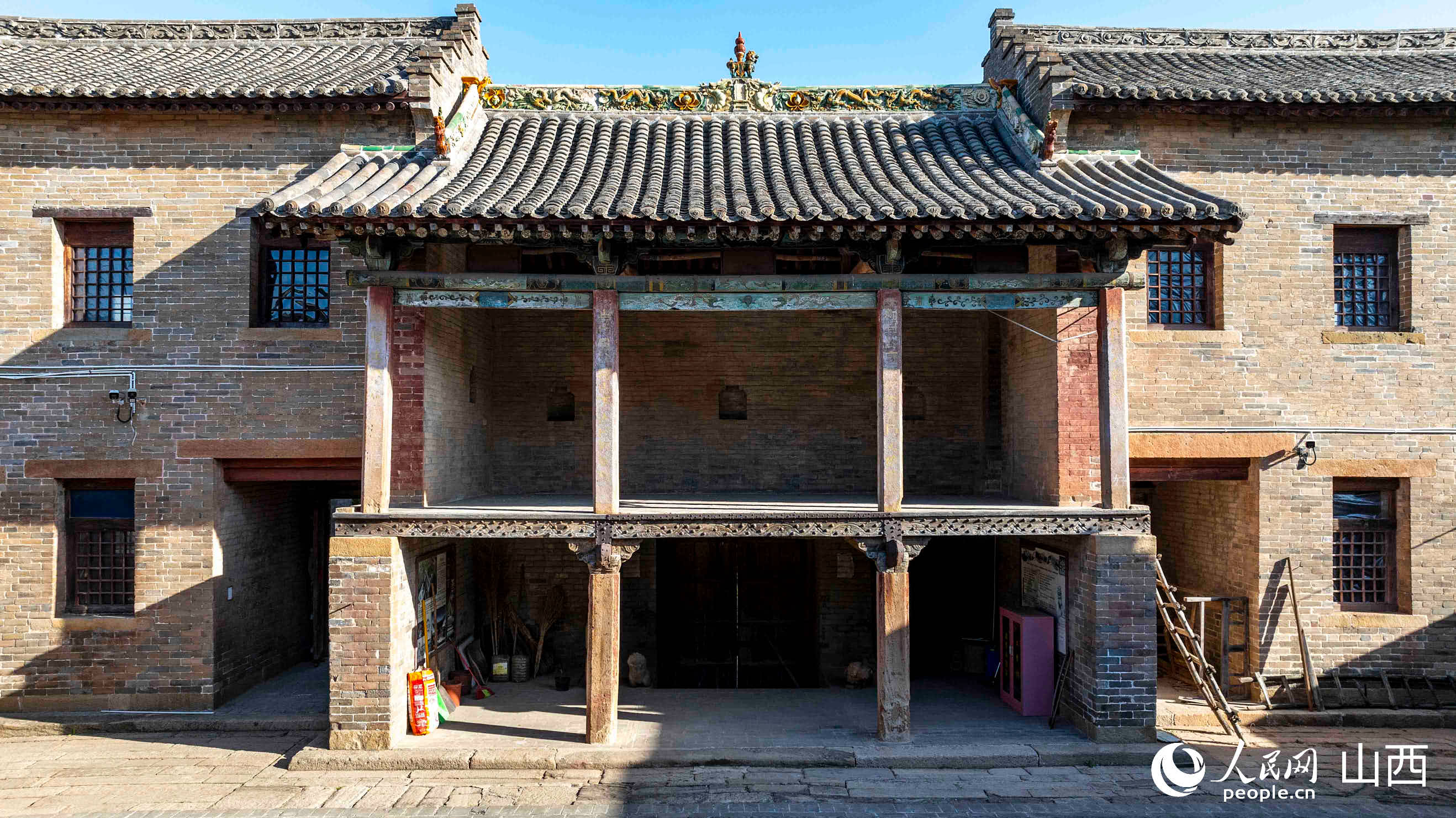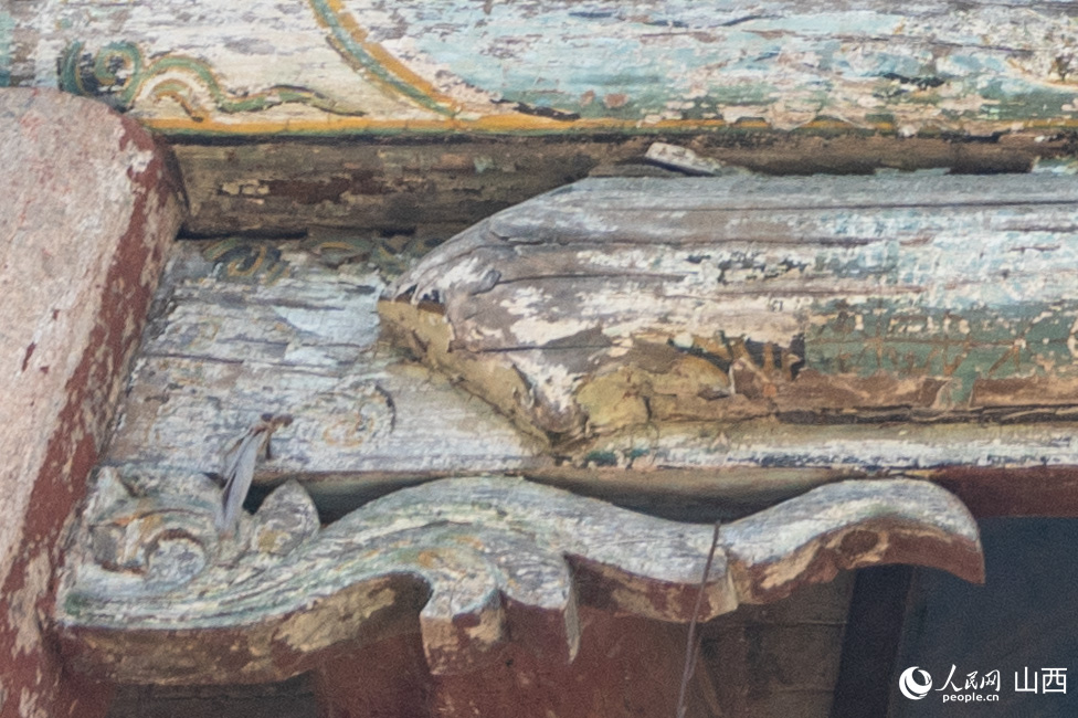拾級而上,山門之上的倒座戲樓豁然開朗。這個曾用油燈與火把照明的舞臺,其存在本身就是建筑智慧的結晶。尤為罕見的是山墻頂部的五疊式馬頭墻,這種源自徽派建筑的設計,不僅阻隔了明火隱患,更將戲臺與兩側妝樓的木構徹底隔離,見證了明清時期晉東南與贛皖地區的美學碰撞。