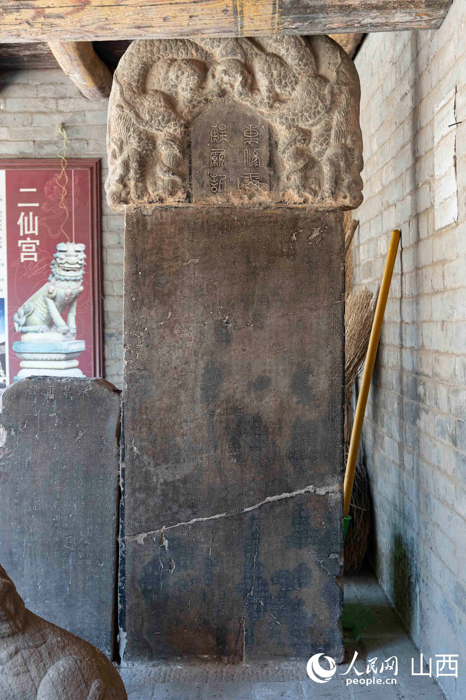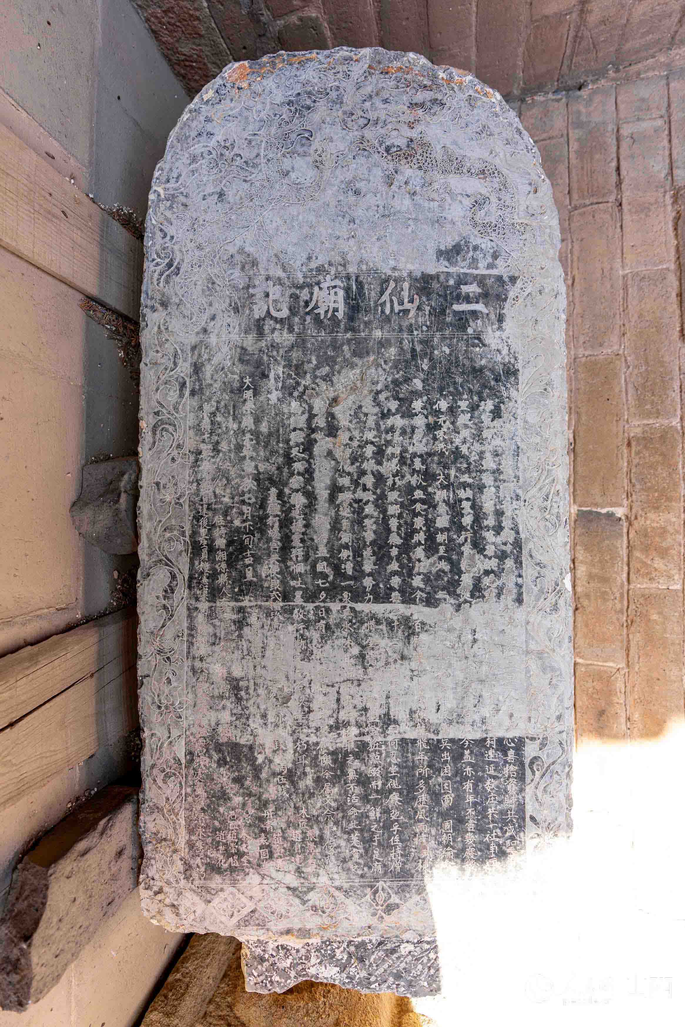 正殿兩側清代同治年間的碑刻遙相呼應,東為《重修二仙廟碑記》,通高4.46米(含碑首),碑首高浮雕雙龍戲珠紋,間刻“真澤圣”三字,附載“萬善同歸”銘文。西為《翠屏山靈貺王廟重修碑記》,通高4.36米(含碑首),碑首刻“靈貺王”字樣,附載“福緣善慶”銘文。靈貺王廟坐落在翠屏山之巔,現僅存殿宇基石等遺址。為保護碑記,便移至二仙宮保存。兩通石碑線條流暢、精細,從雕刻工藝來看,這兩通石碑應該是出自同一匠人之手。