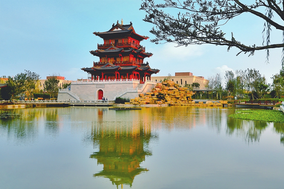 2024年建成的晉都公園,樓閣臨風與湖水相映,美不勝收。 張俊波攝
