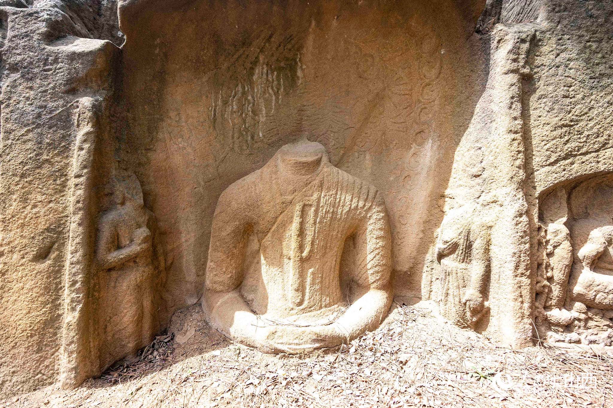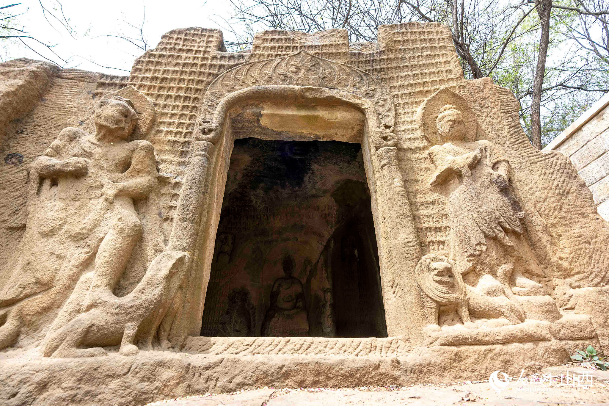 這方砂巖鑿就的藝術圣殿,處處盡顯文明交融之痕跡。門楣處的忍冬紋飾,葉脈間暗藏佛教傳播與藝術本土化的復雜進程。殘存的力士造像足踏獅象設計,巧妙融合印度佛教象征體系與中國門神文化傳統。