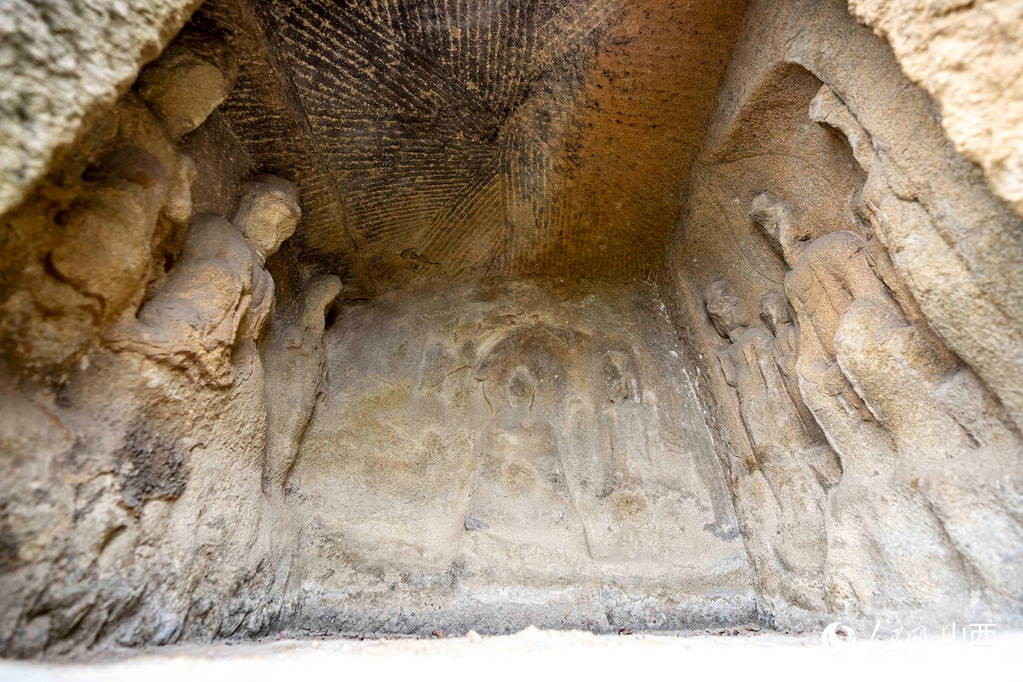 羊頭山石窟群中尚有一處未被正式編號收錄的石窟。該窟外觀較為素樸簡陋,窟門處未見造像,僅存刻劃印記??邇痊F存數尊佛像,但窟內四壁除現有佛像外,再無其他開鑿痕跡,亦再無其他雕飾。整體觀之,該窟呈現出明顯的未完工狀態,推測可能為一項中途停工的工程遺跡。