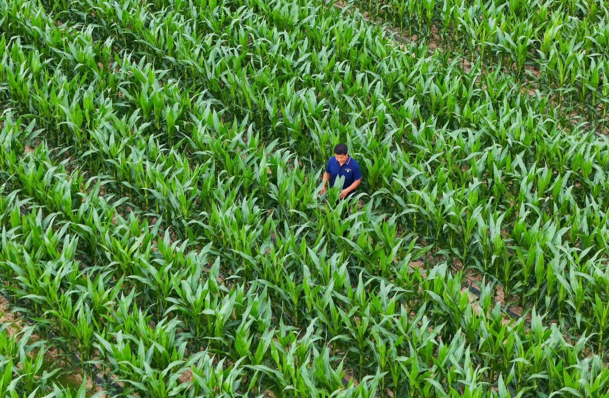 農技專家在地里查看玉米長勢。