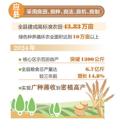 2024年,該縣核心區示范田畝產突破1300公斤,全縣糧食總產量達6.7億斤,較三年前增長14.8%,實現了從“廣種薄收”到“密植高產”。