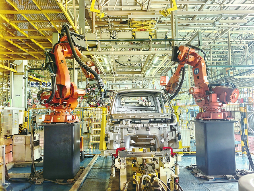 沖壓車間里,經拉延、修邊、沖孔、成型等工序打磨的產品,流轉至焊裝環節。41臺焊接機器人揮舞機械臂,點焊、弧焊、螺柱焊自動化率達50%,高效運轉提升整條生產線效率。涂裝車間內,透過玻璃幕墻可見電泳液無死角滲透車身,如同為其披上高抗腐“防護服”??傃b車間中,車身的“經絡”“骨骼”“皮膚”“血液”經標準流程精準組裝,最終形成各式車型。