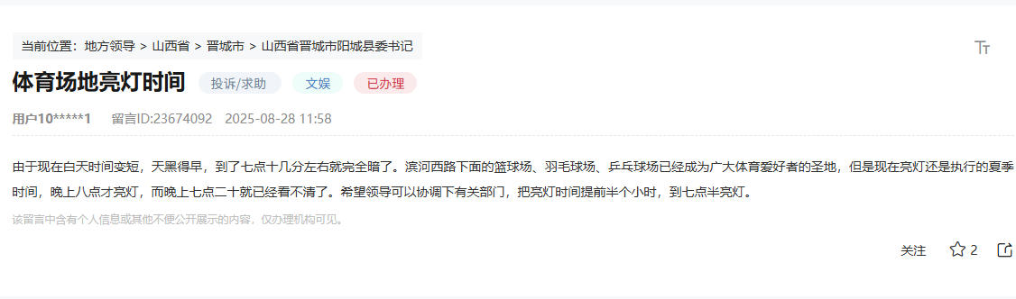 近日,山西陽城一位網友在人民網“領導留言板”寫下留言,認為照明設施開啟時間不合理,會給進行體育鍛煉的人造成不便,建議按照時令更改照明設施開啟時間。