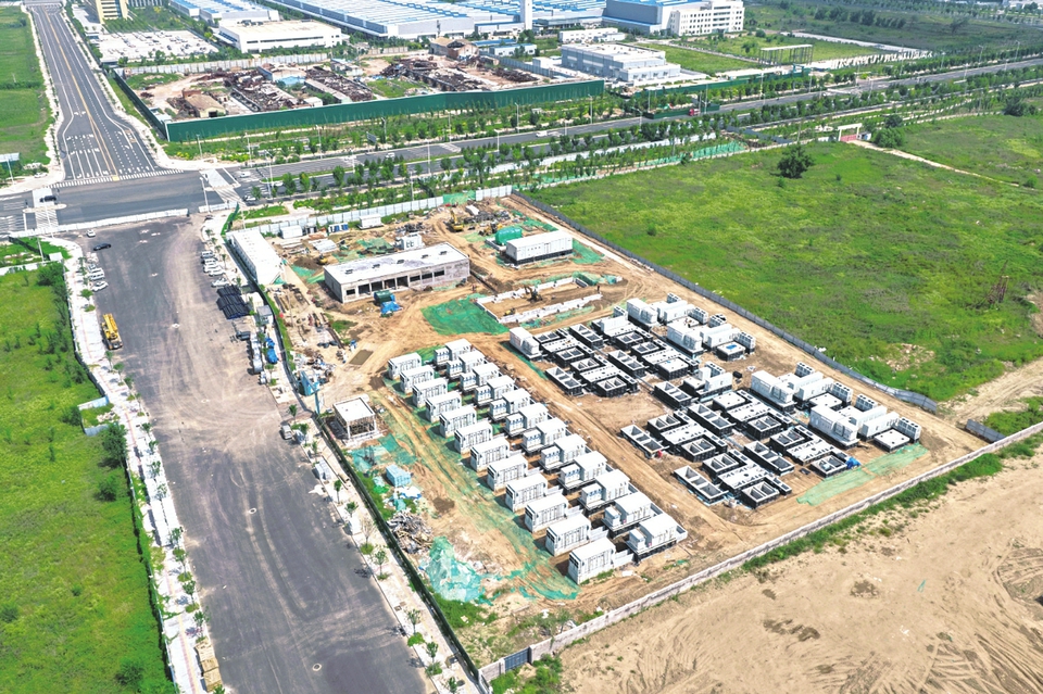 10月3日,山西轉型綜改示范區,俯瞰太原智儲100MW獨立儲能電站項目建設工地。該項目采用領先儲能技術,建成后將增強電網調峰能力,提升電網安全性,推動能源結構低碳轉型。(記者 王瑞瑞攝)