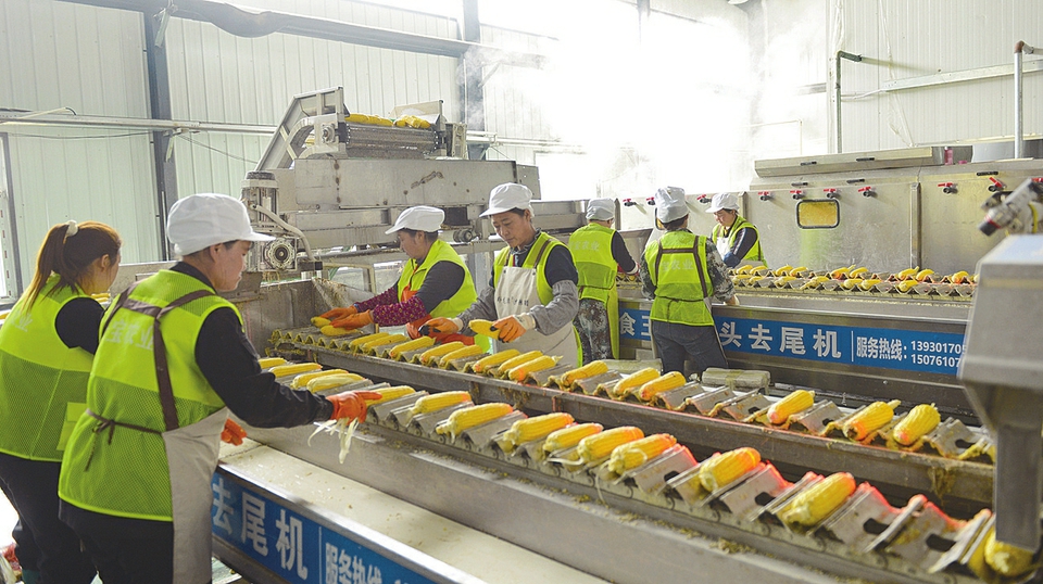 10月5日,山西晉寶農產品開發有限公司玉米自動化流水生產線上,工人們正在有序操作,保障節日市場供應。(楊應平 攝)