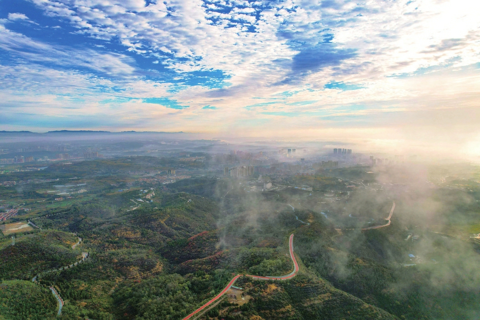 10月11日,雨后的平定縣冠山空氣清新,山林青翠欲滴,山巔白云舒展,山腳下的平定縣城在云海中若隱若現。(杜愛清 攝)