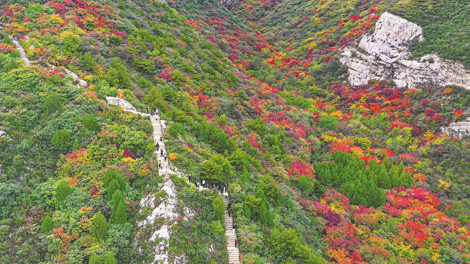 近日,太原市崛(山圍) 山紅葉呈現“赤紅云?!钡囊曈X景觀。游客穿梭林中,漫步賞景,構成一幅人與自然和諧共生的秋日畫卷。(張好攝)