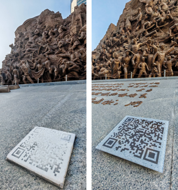 網友留言附圖。左圖為雕塑北側二維碼;右圖為雕塑南側二維碼。